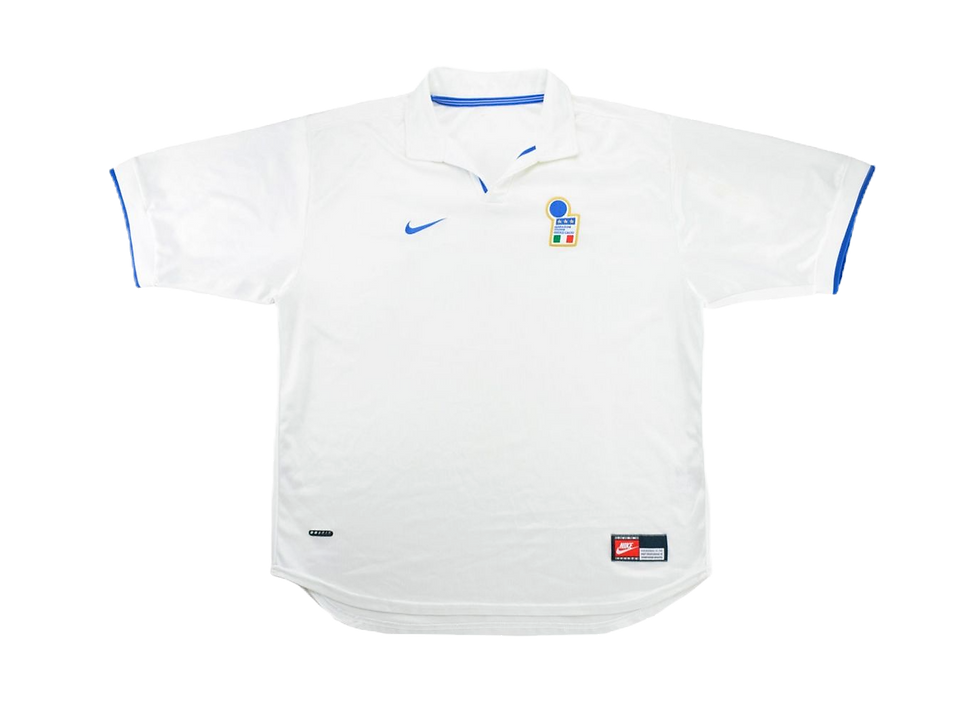 El elemento central es la franja horizontal azul que cruza el pecho, la cual incorpora un característico diseño geométrico de diamantes y el patrocinador "SAMSUNG" en color blanco. El diseño se completa con un elegante cuello de polo blanco con ribetes en azul y rojo, a juego con los puños elásticos de las mangas. En el pecho se ubican el logotipo de Lotto y el escudo tradicional de CDUC, consolidando una de las equipaciones visitantes más recordadas de mediados de los 90.